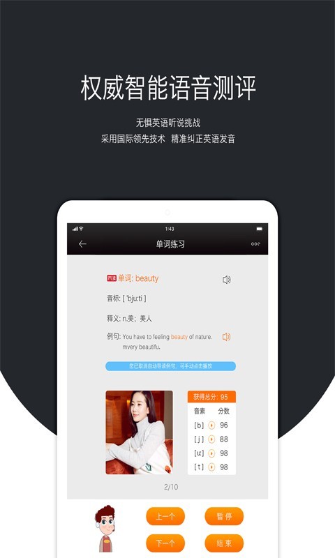 能够根据用户的发音为您及时的纠正让你可以学习到最纯正的英语口语;